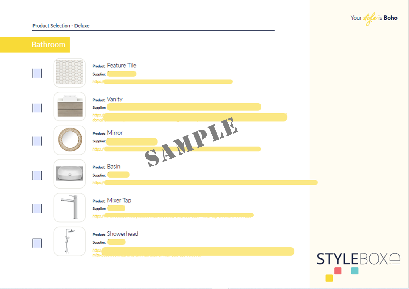 - A complete list of product selections for renovating or styling your room with classic and deluxe budget options (approximately 18 – 22 individual items per room or over 120 items for the entire home package) See what’s included here